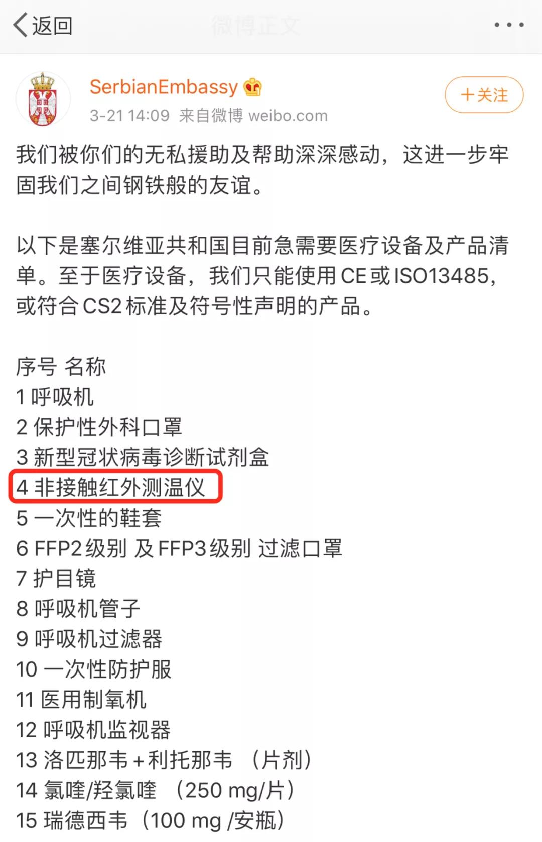 大概是感受到了中(zhōng)國人民的如火熱情,3月18日,塞爾維亞駐華大照新使館開通了官方微(wēi)博。幾天後,也就是21日,他們麗市(men)發布了急需物(wù)資的清單: