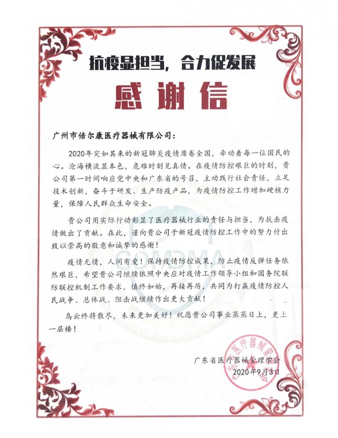 在現場,倍爾康收到了廣東省醫療器械管理學會的感謝信——對倍爾康在疫情期間制吧(jiān)加班加點保質量促生産,發揚廣東省醫療器械大愛無疆的奉獻精綠北神,助力一線防控表示感謝!