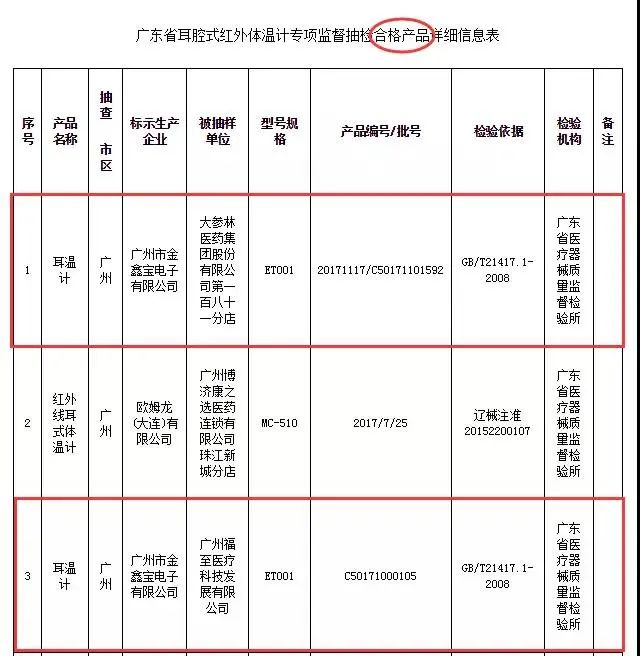 2019年的5月, 廣東省藥監局對市場上的醫療器械産品進行抽查,公道倍爾康耳溫計ET001也在合格名單上!