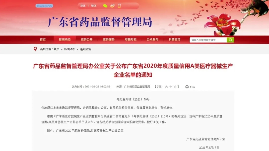 根據《廣東省醫療器械生産企業質量信用分類監管工(gōng)作人們(zuò)的意見》(粵食藥監械〔2011〕110号)的湖我有關規定,廣州市康擇善醫療器械有限公司有幸被評為“廣東省2020年度質量信用刀看A類醫療器械生産企業”。