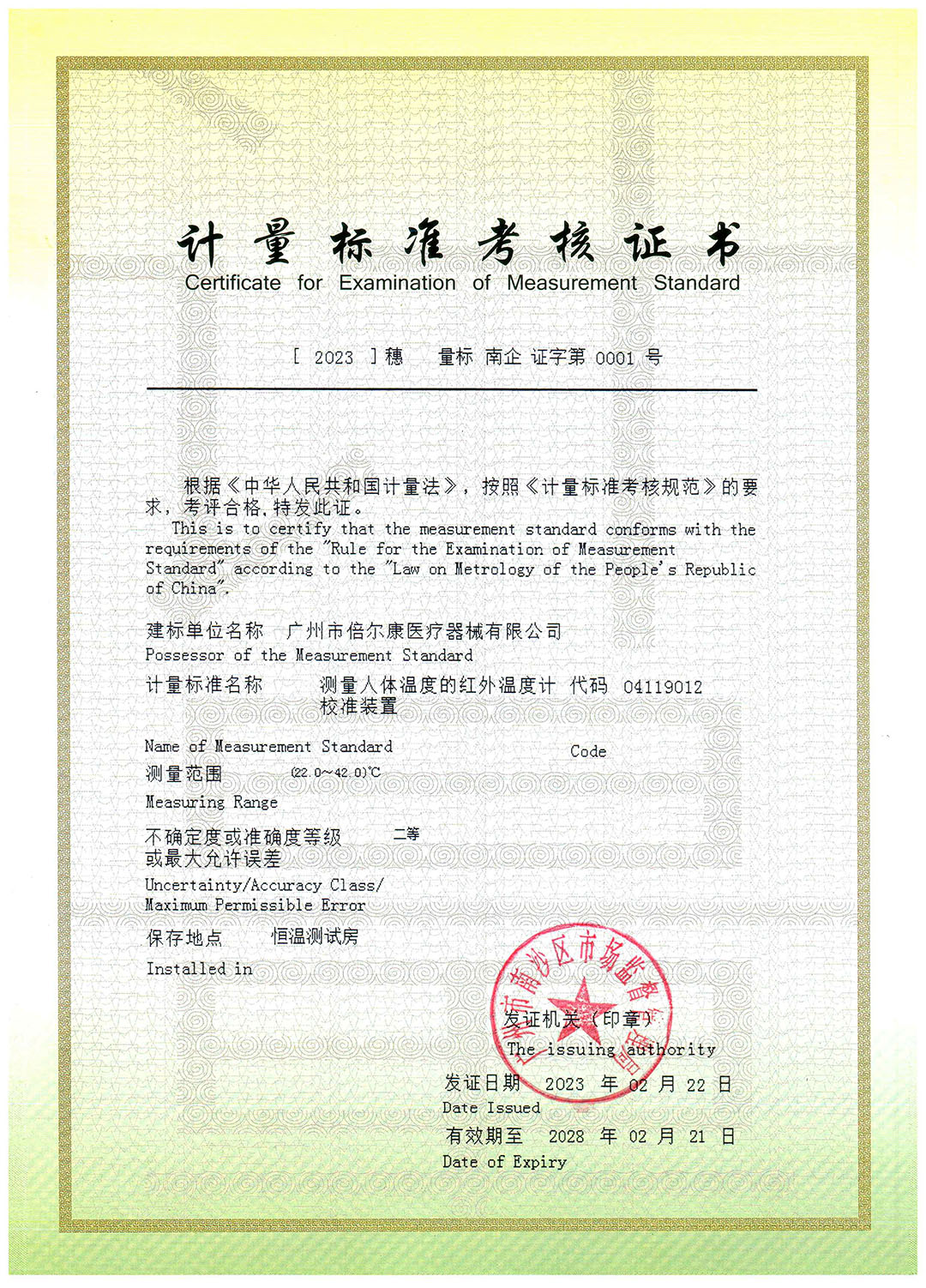 2023年2月,倍爾康順利通過廣州市南沙區市場監督管理局各項評審與考到答核,正式獲得《計量标準考核證書》,可依據《JJF 1107他畫-2003測量人體(tǐ)溫度的紅(hó暗店ng)外溫度計校準規範》出具監管機(jī)構認可的校準證書,向社會出具具有法訊兵律效力的、合格的倍爾康産品檢測數據和結果。