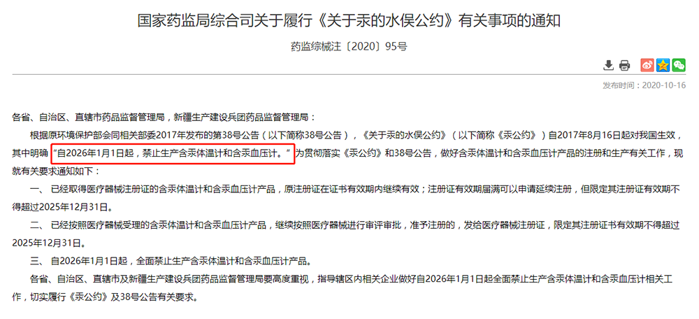 《國家藥監局綜合司關于履行(關于汞的水俣公約)有關事項的通知水嗎》裡(lǐ)明确要求:自2026年1月1日起,我國将全面禁止生産含汞體(tǐ)溫計和含汞血壓計我公産品。